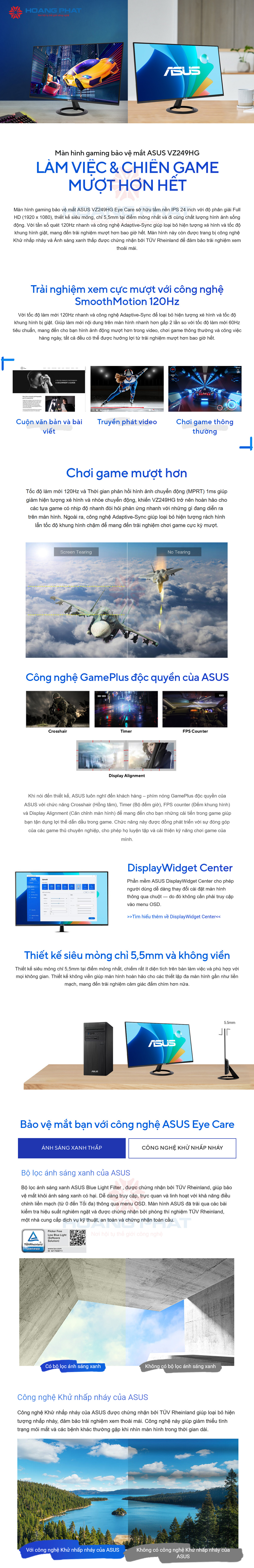 Màn hình gaming bảo vệ mắt ASUS VZ249HG Eye Care – 24 inch (có thể xem 23,8 inch), IPS, Full HD, 99% sRGB, Không viền, 120Hz, SmoothMotion, 1ms (MPRT), Adaptive Sync, bảo vệ mắt Eye Care Plus, Ánh sáng xanh thấp, Khử nhấp nháy, Có thể treo tường